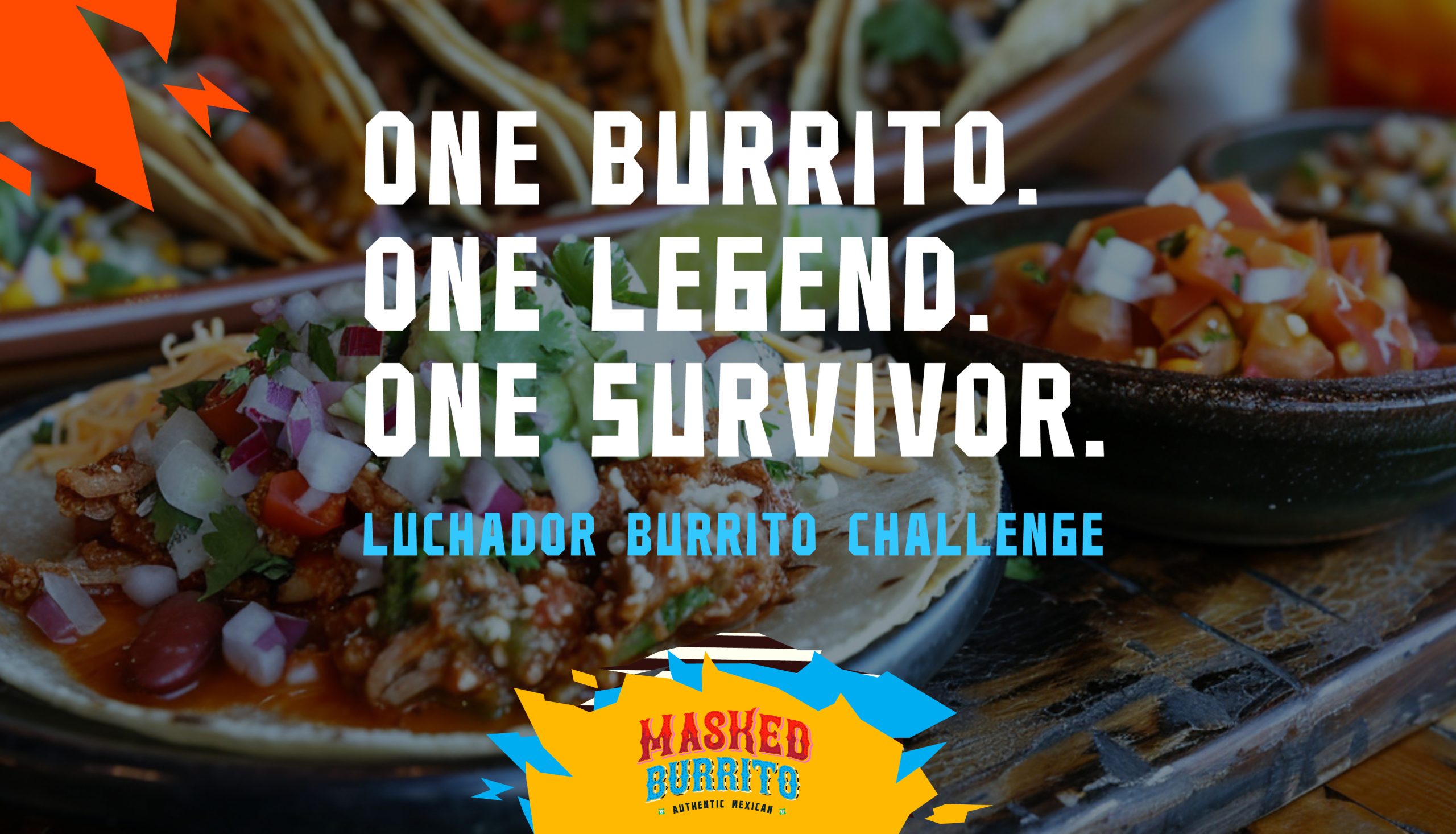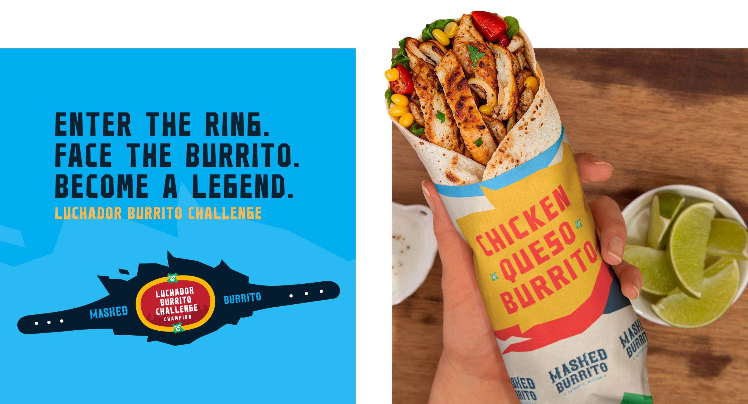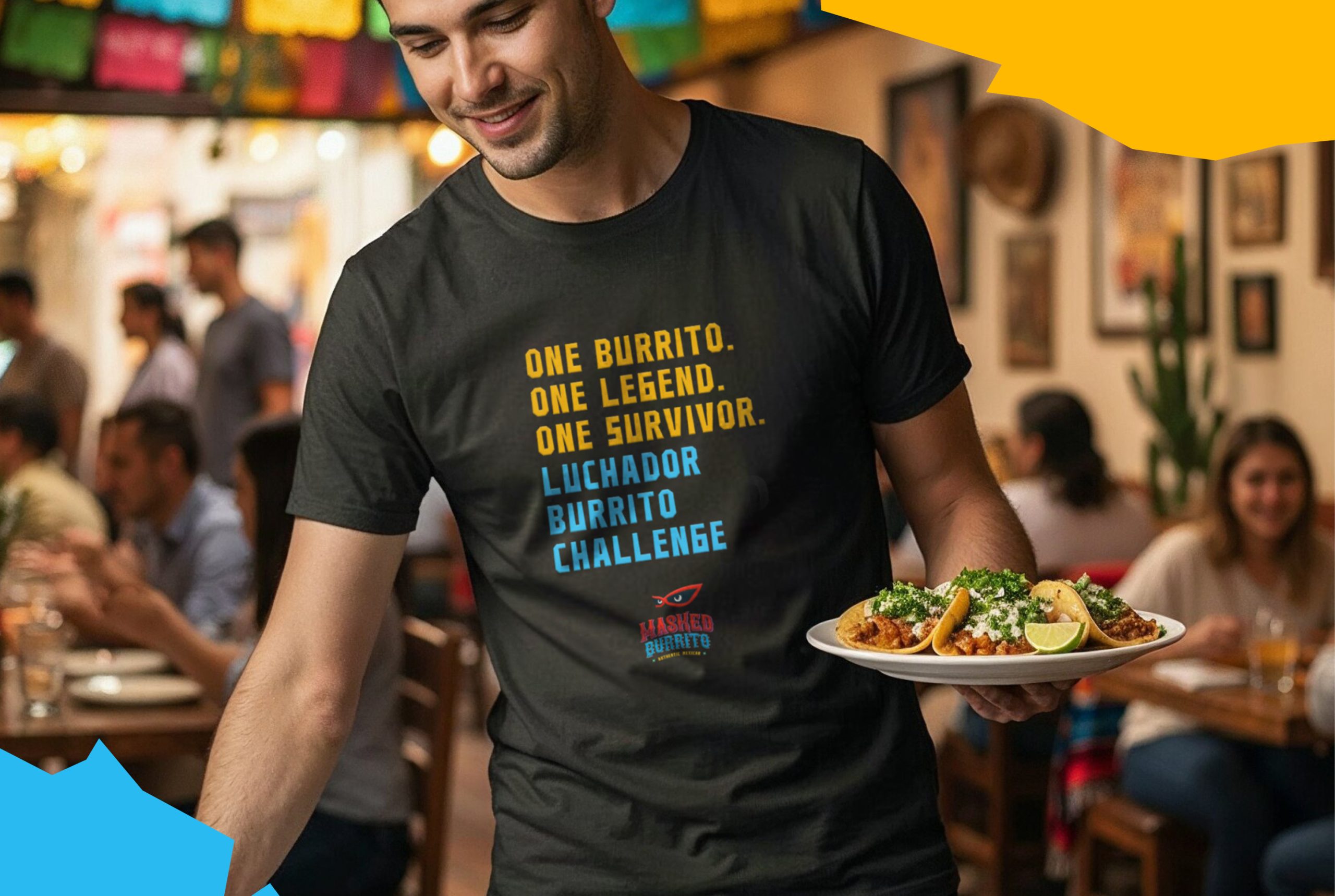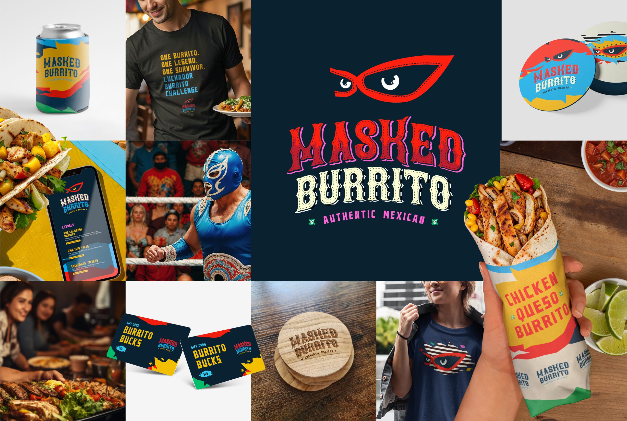 Bright, vibrant colors draw inspiration from traditional lucha libre masks and festive Mexican palettes, building an atmosphere that’s both welcoming and distinctive. A marquee-style logo spotlights the restaurant’s signature event—the Luchador Burrito Challenge—while the branding extends seamlessly across menus, signage, and marketing collateral.