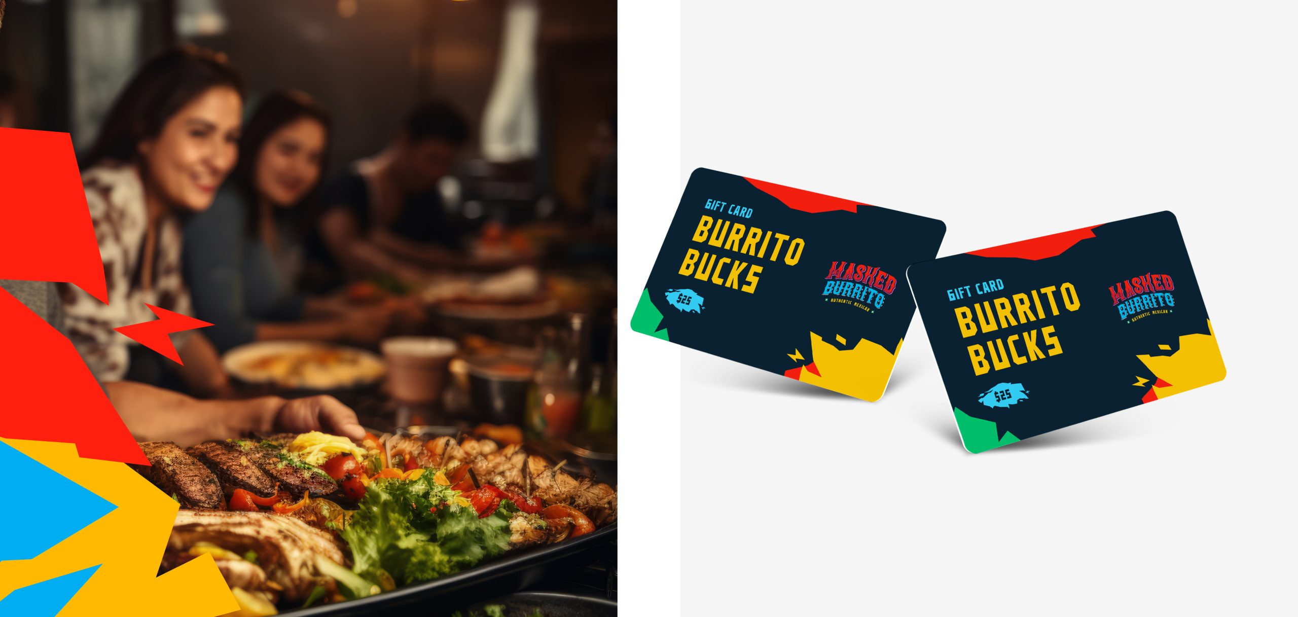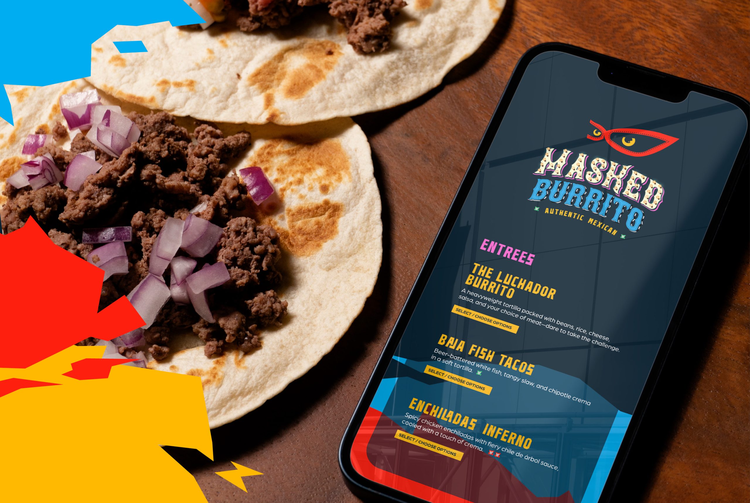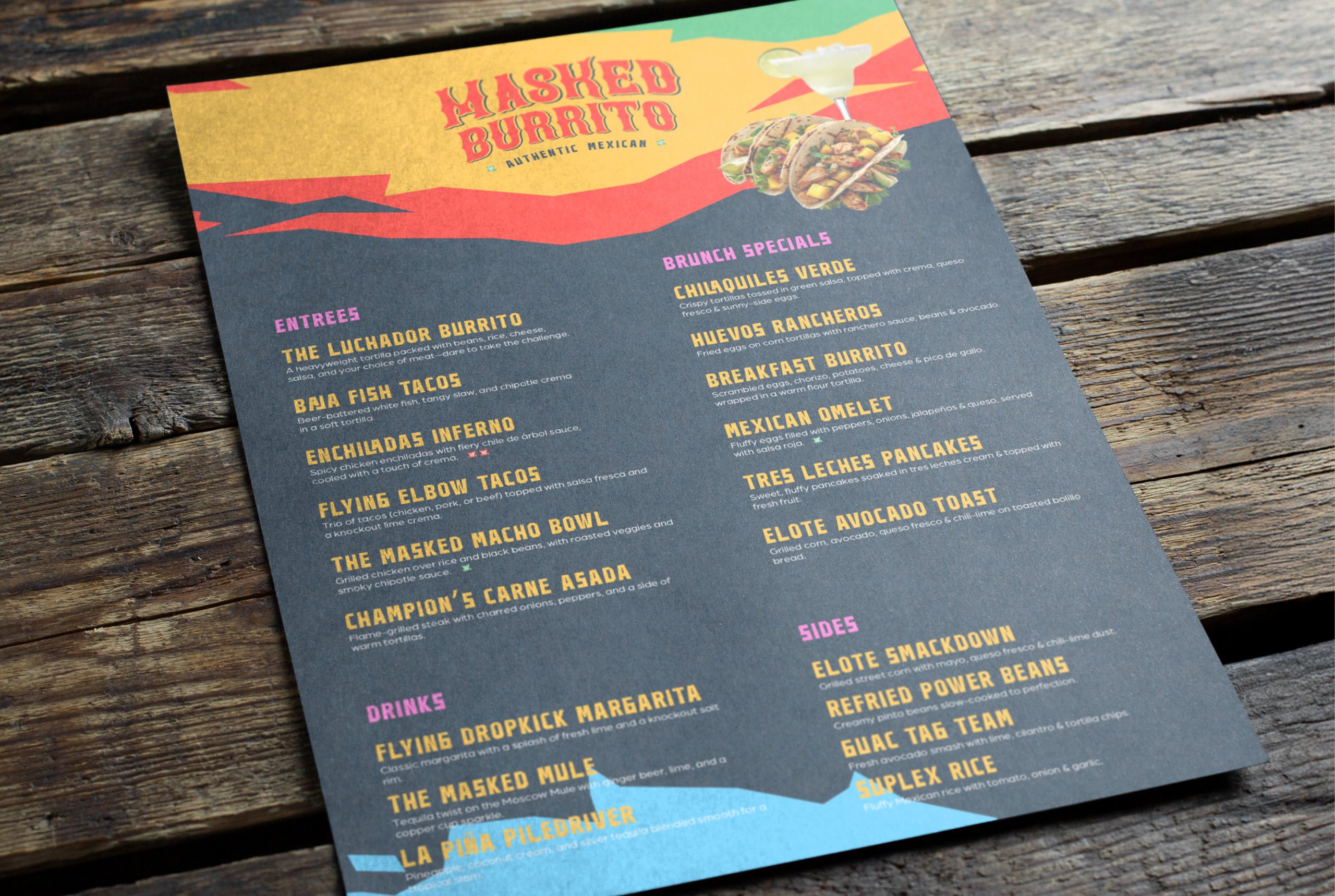 I created the brand identity for Masked Burrito, a Mexican restaurant founded by a retired luchador-turned-chef. The visual system blends authentic cuisine with a bold, celebratory aesthetic.